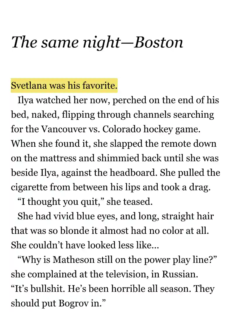 Svetlana plays a smaller role in the book and doesn't appear until chapter 15. She's a long-term hookup in Boston, not Ilya's childhood friend. The show significantly expands her backstory, added multiple scenes with her and Ilya, and strengthen his relationship with Ilya.