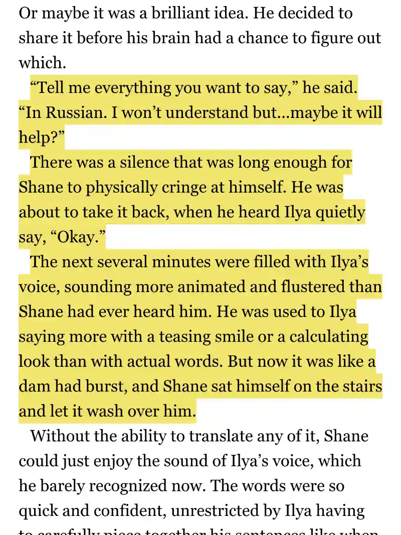Ilya's Russian monologue doesn't exist in the book. That chapter is written from Shane's perspective, and he doesn't understand what Ilya is saying. The show created the monologue from scratch, and it became one of the most heartbreaking scenes in the season.