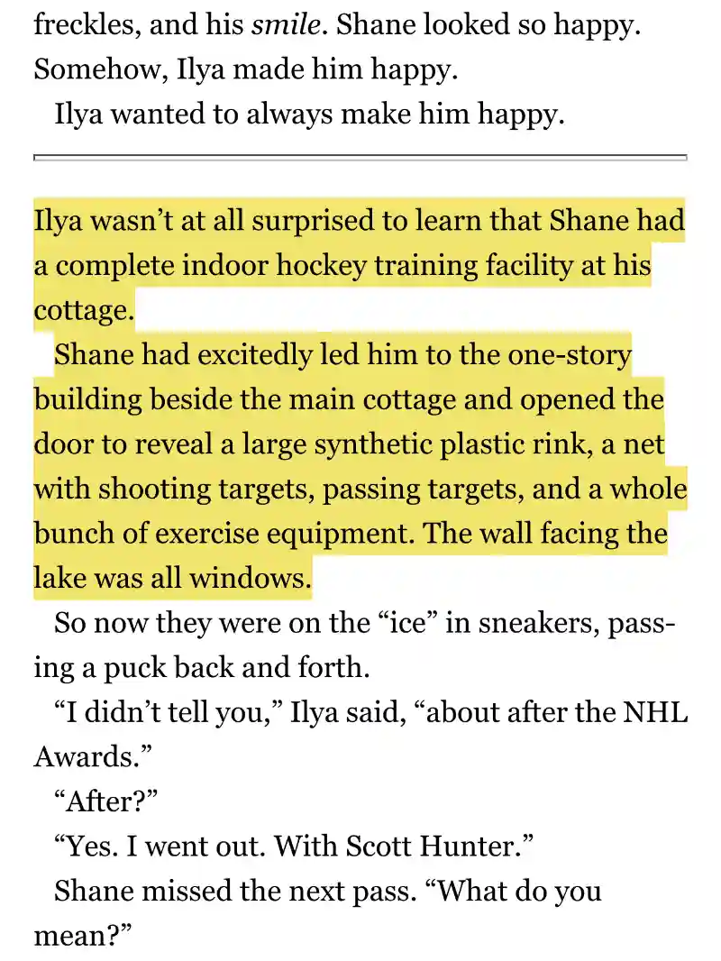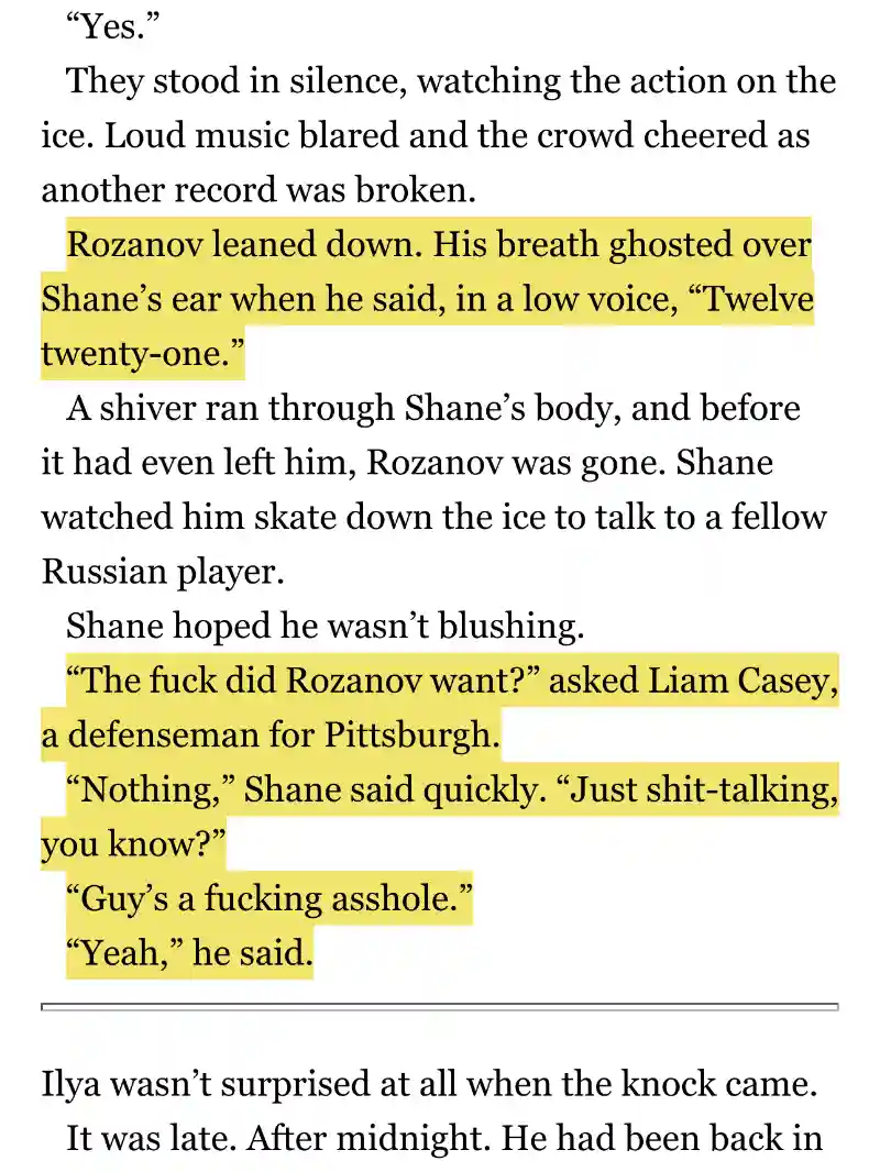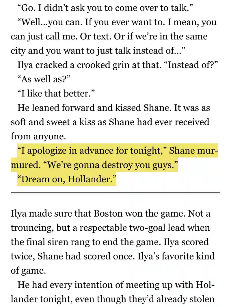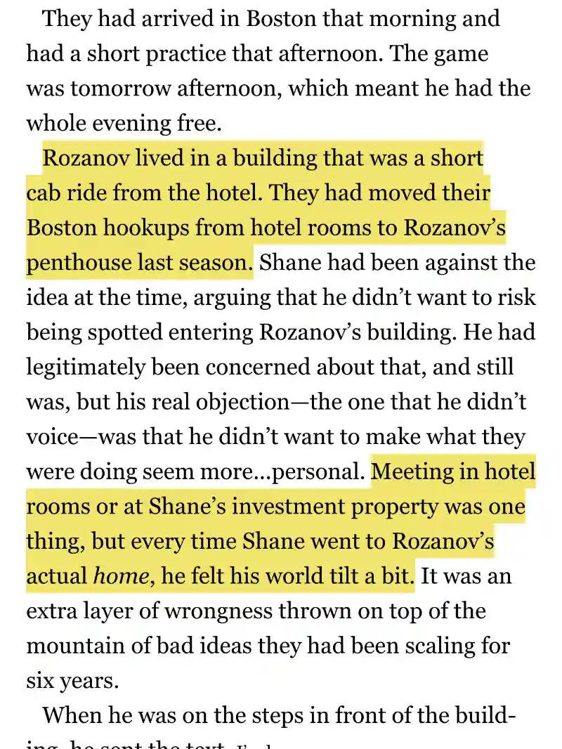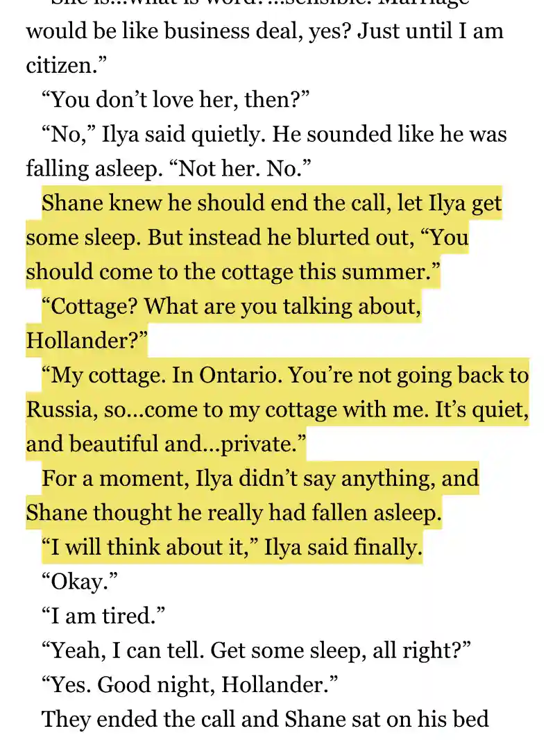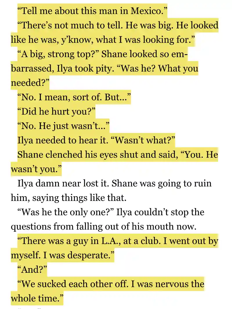 The Tampa Bay hotel room scene is longer in the book. In the show, it ends after Ilya reveals his dad has dementia (side note: changed from Alzheimer's from the book) and breaks down crying, with Shane comforting him. In the book, they keep talking, and Ilya doesn't cry in that scene. Ilya also mentions that the cross he always wears belonged to his mother, and Shane and Ilya discusses when they could spend real time together, somewhere no one knows them, with Ilya asking "when will I have you for as long as I want?"