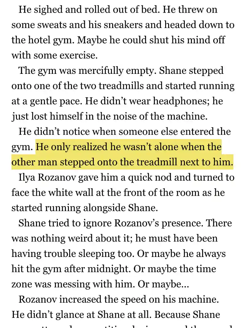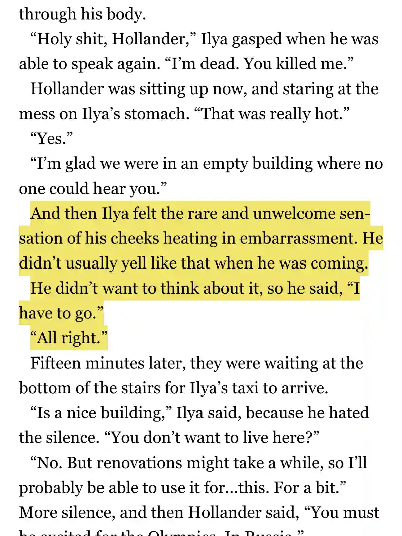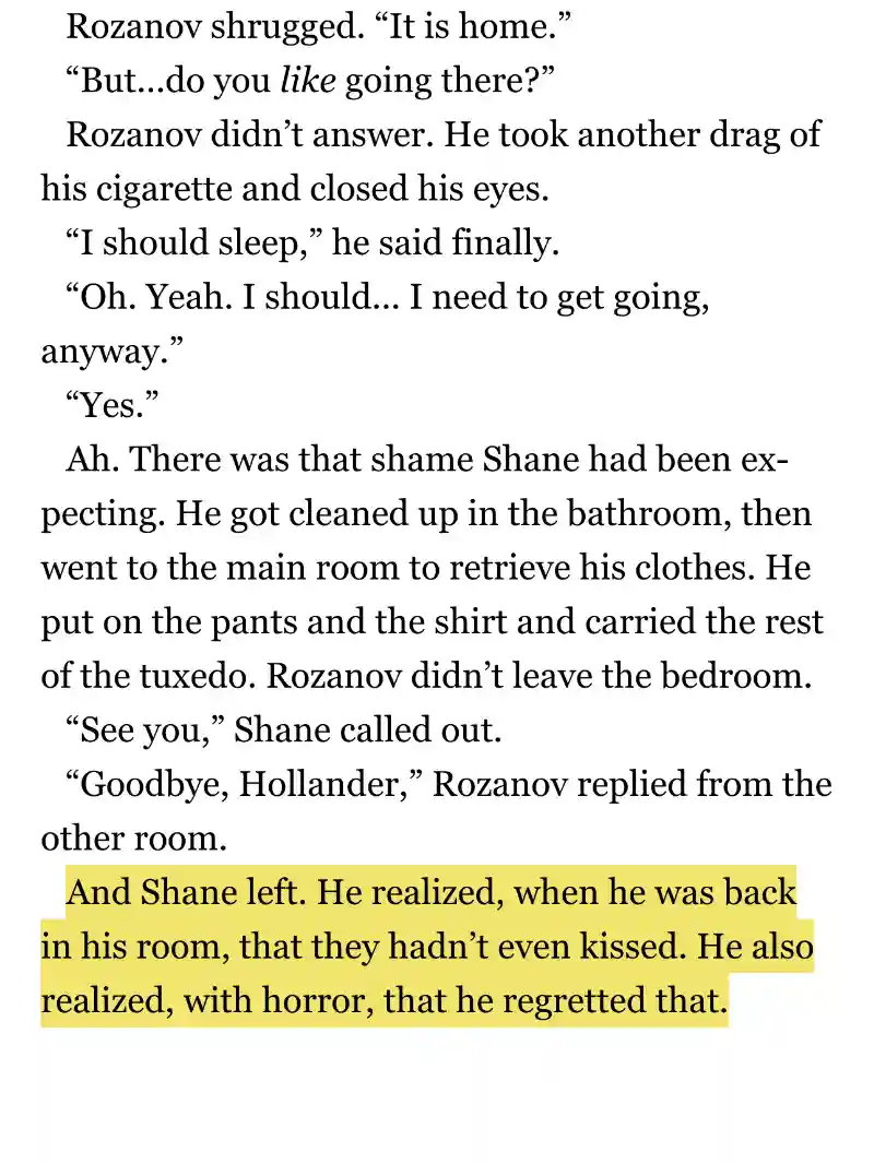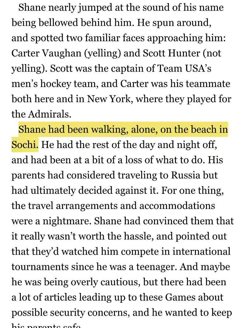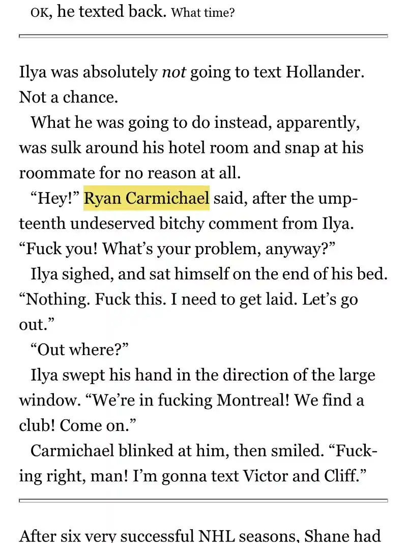 The Tampa Bay hotel room scene is longer in the book. In the show, it ends after Ilya reveals his dad has dementia (side note: changed from Alzheimer's from the book) and breaks down crying, with Shane comforting him. In the book, they keep talking, and Ilya doesn't cry in that scene. Ilya also mentions that the cross he always wears belonged to his mother, and Shane and Ilya discusses when they could spend real time together, somewhere no one knows them, with Ilya asking "when will I have you for as long as I want?"