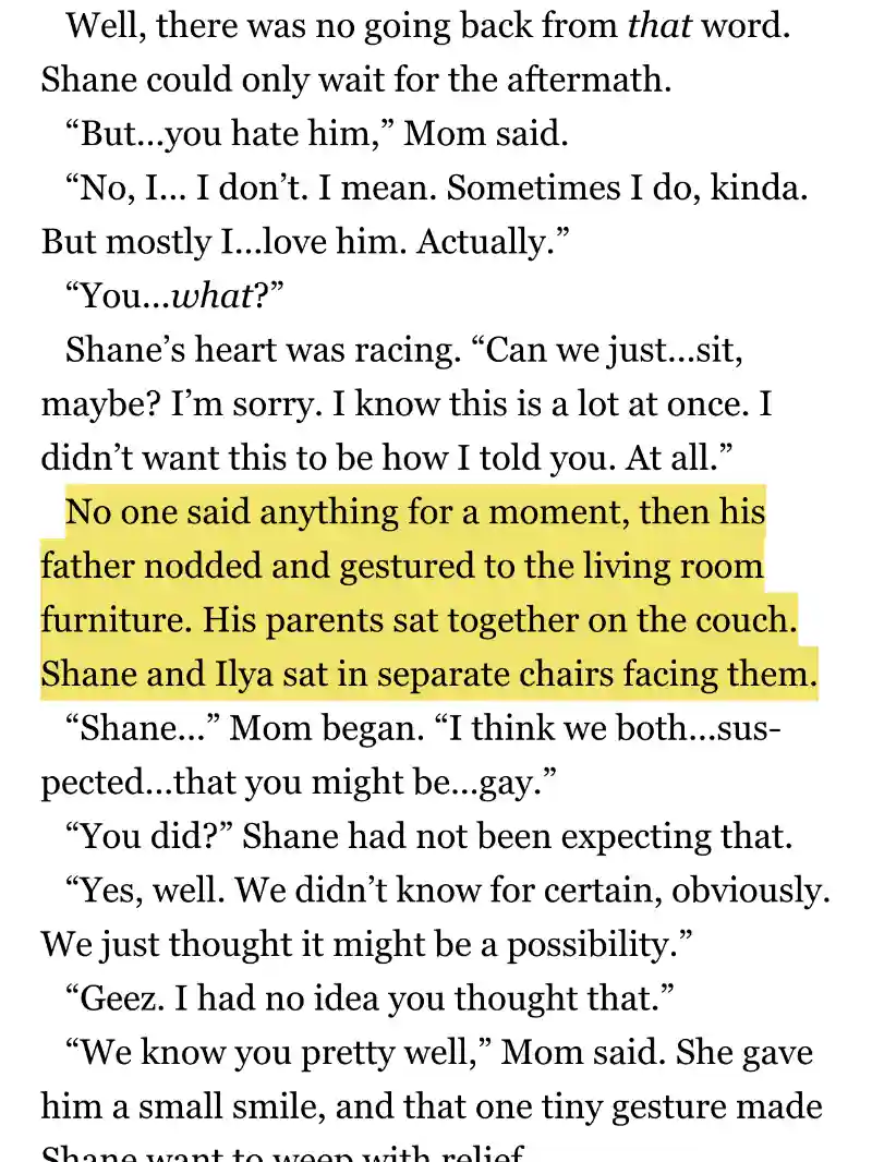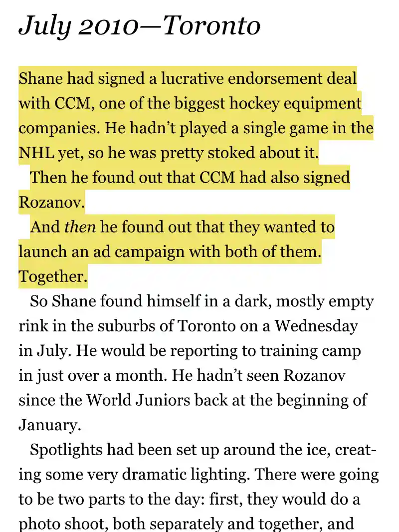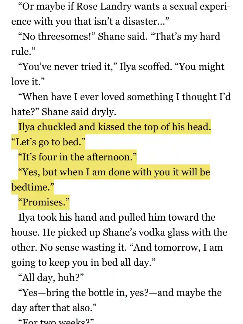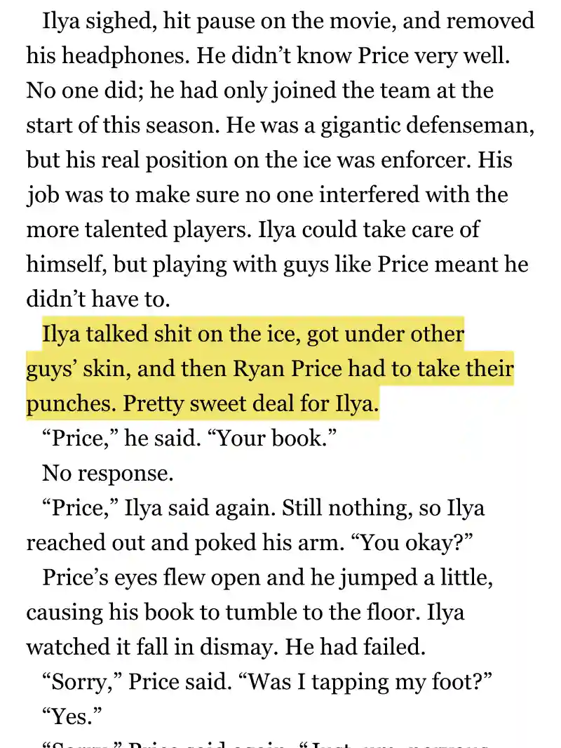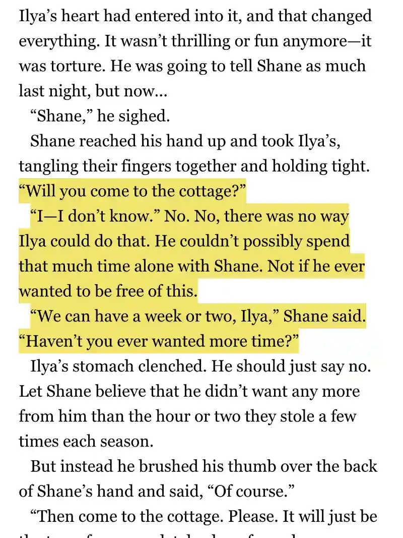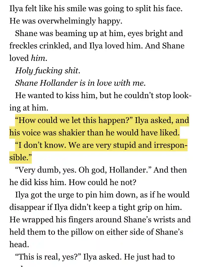 The Tampa Bay hotel room scene is longer in the book. In the show, it ends after Ilya reveals his dad has dementia (side note: changed from Alzheimer's from the book) and breaks down crying, with Shane comforting him. In the book, they keep talking, and Ilya doesn't cry in that scene. Ilya also mentions that the cross he always wears belonged to his mother, and Shane and Ilya discusses when they could spend real time together, somewhere no one knows them, with Ilya asking "when will I have you for as long as I want?"