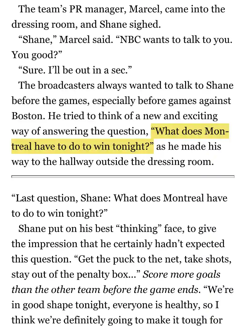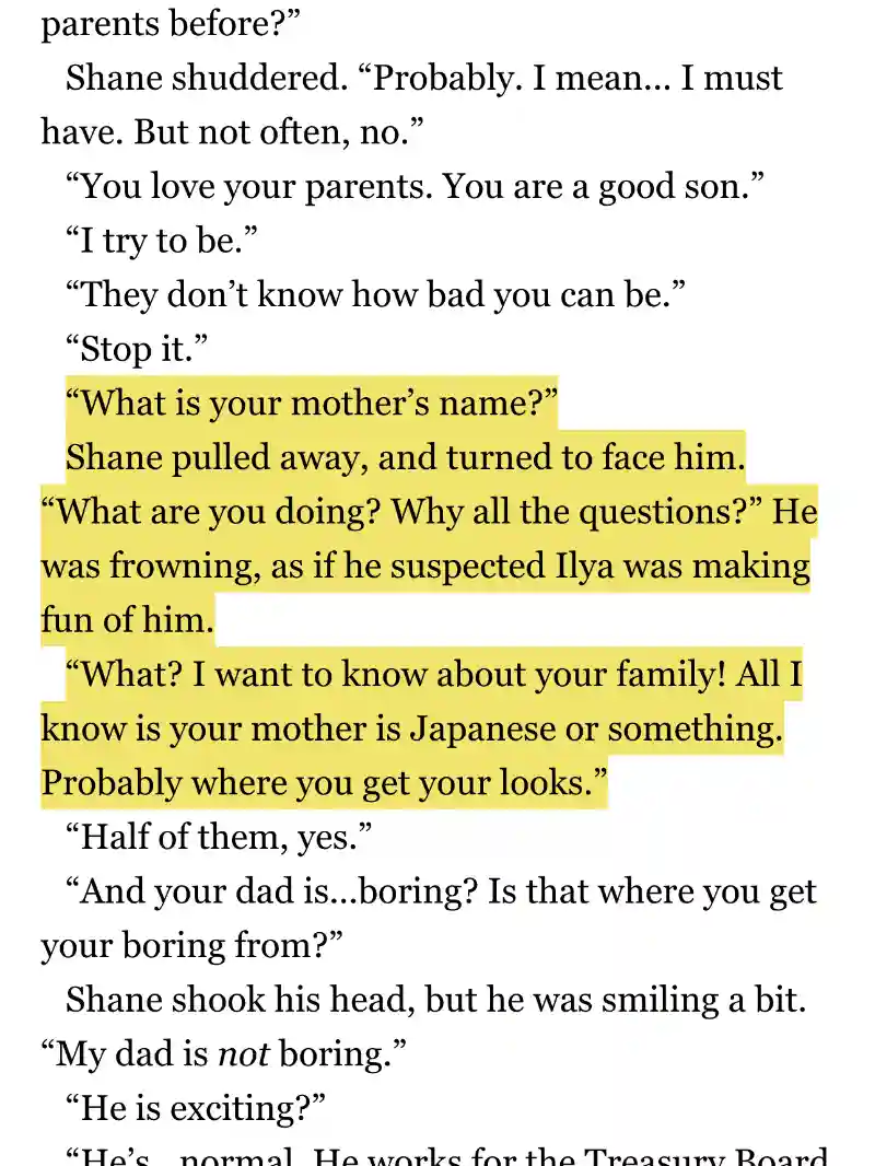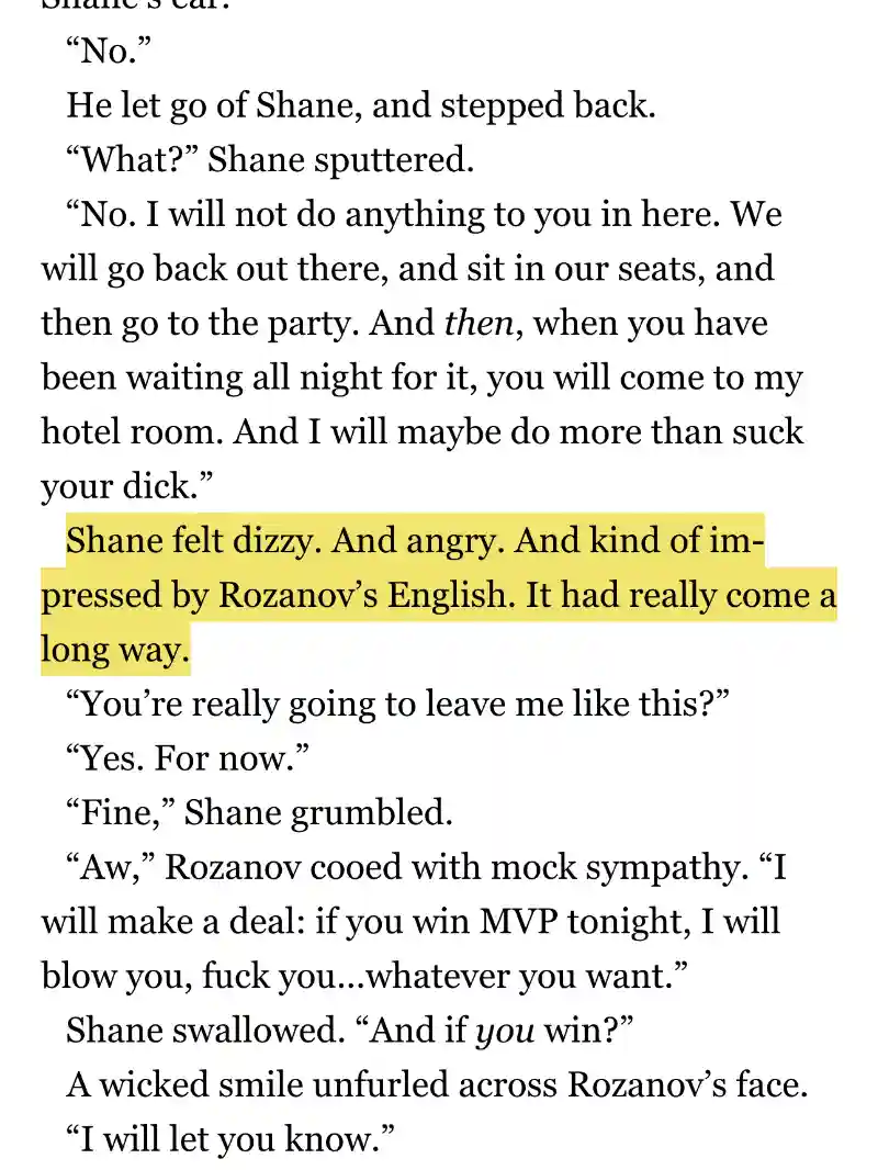 In the book, Shane's only thought in the Las Vegas bathroom scene is being quietly impressed by how much Ilya's English has improved ("it had really come a long way."). Lines like "wow, genetic" and "I read the New Yorker now" are both show additions.