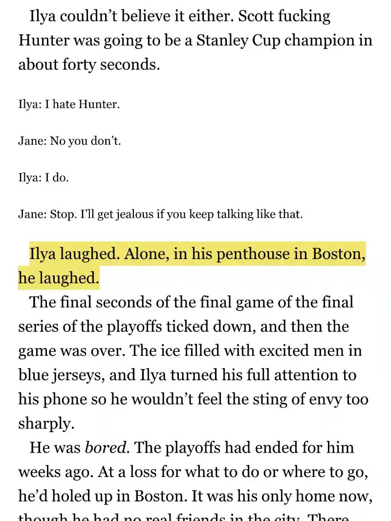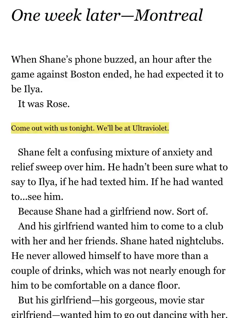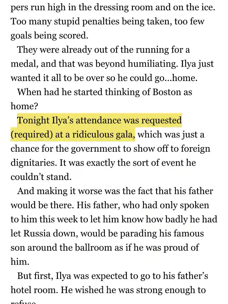 The Russian gala scene - Svetlana, Sasha, all of it - doesn't exist in the book. The book just briefly mentions Ilya is attending a gala. Svetlana in the book is simply a regular hookup in Boston, not an old childhood friend, so she's not in Russia with Ilya at all.