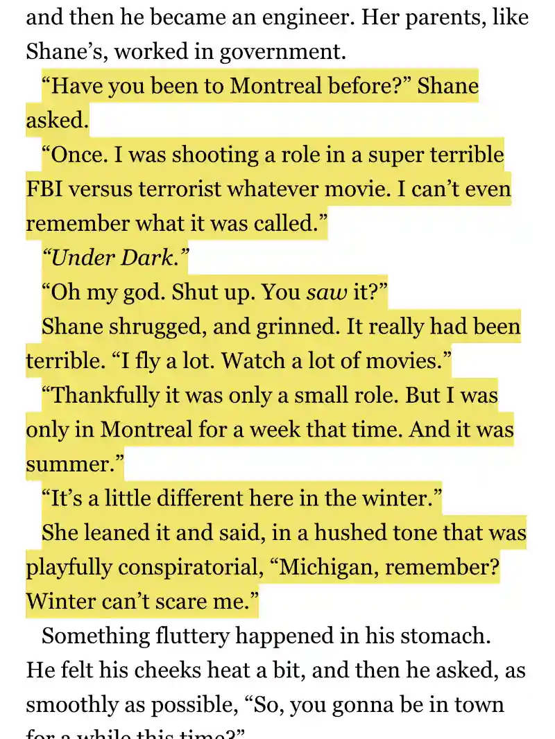 The conversation between Shane and Rose is significantly expanded for the show. In the book, most of what they discuss is either implied or doesn't happen at all. The show builds it out into a full scene, with only "Under Dark" and the line "Michigan, remember? Winter can't scare me" carrying over from the book.